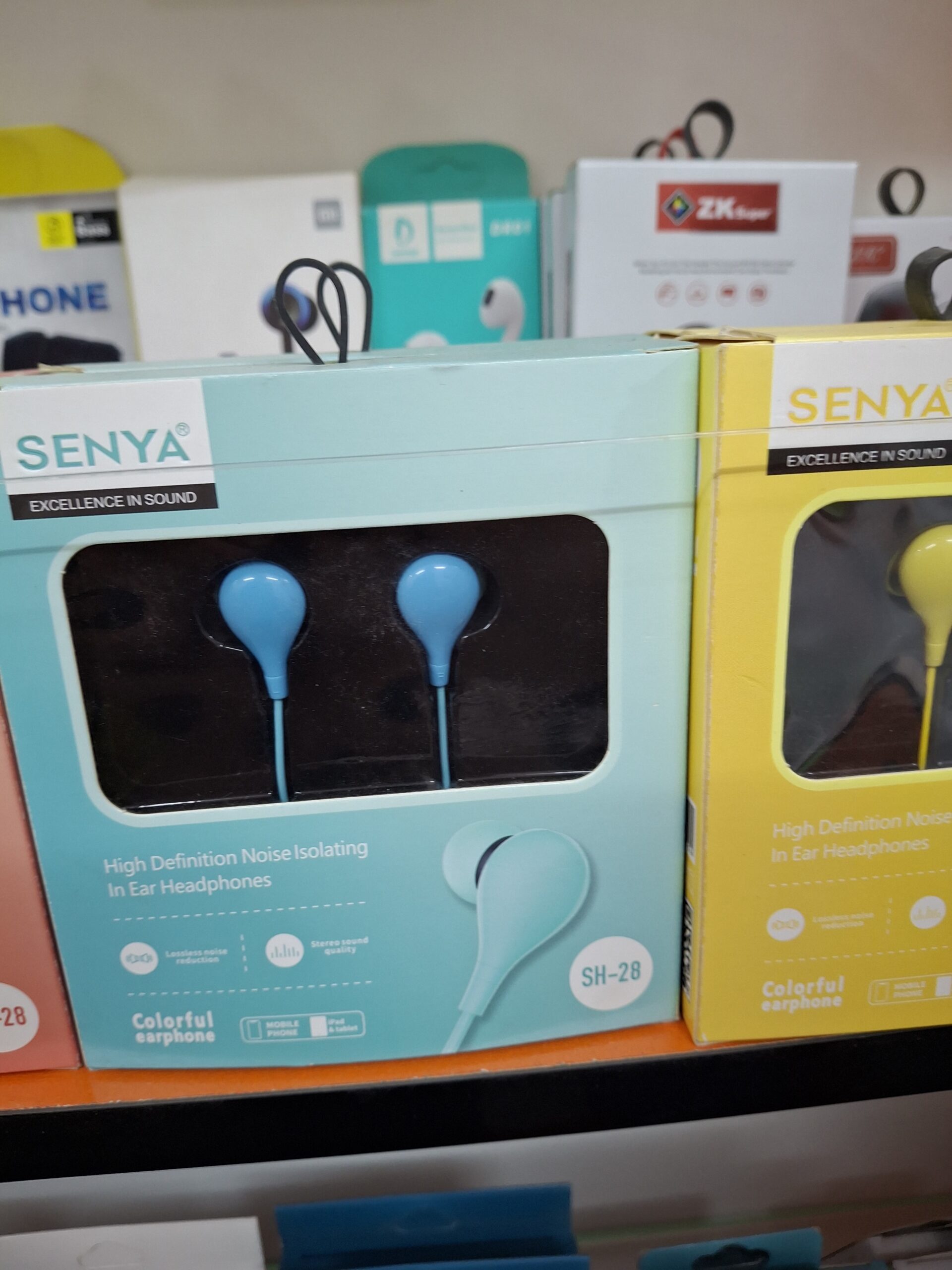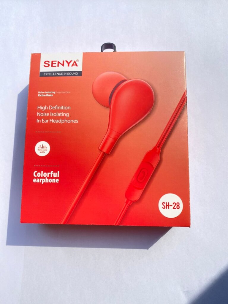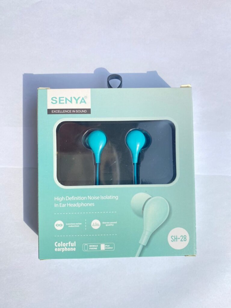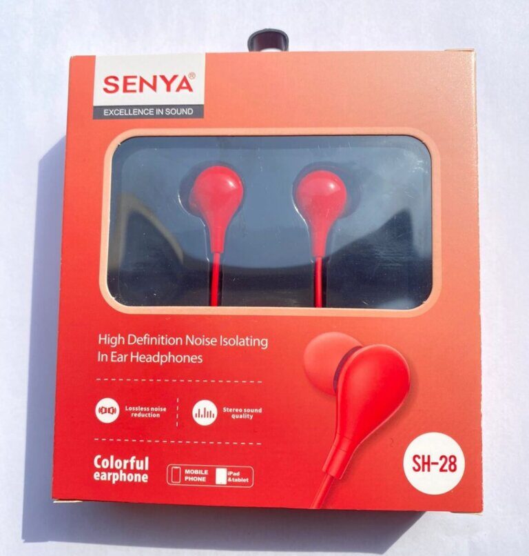 Enjoy clear sound and deep bass with SENYA SH-28 wired earphones, featuring noise isolation, comfortable in-ear fit, and vibrant color options. Available now at Ahmad Mobiles, AWT Phase 2 Lahore.