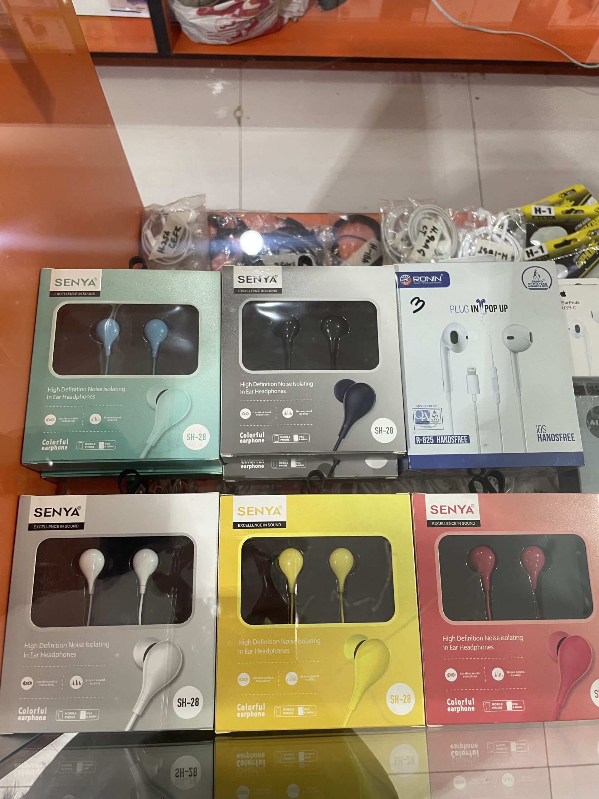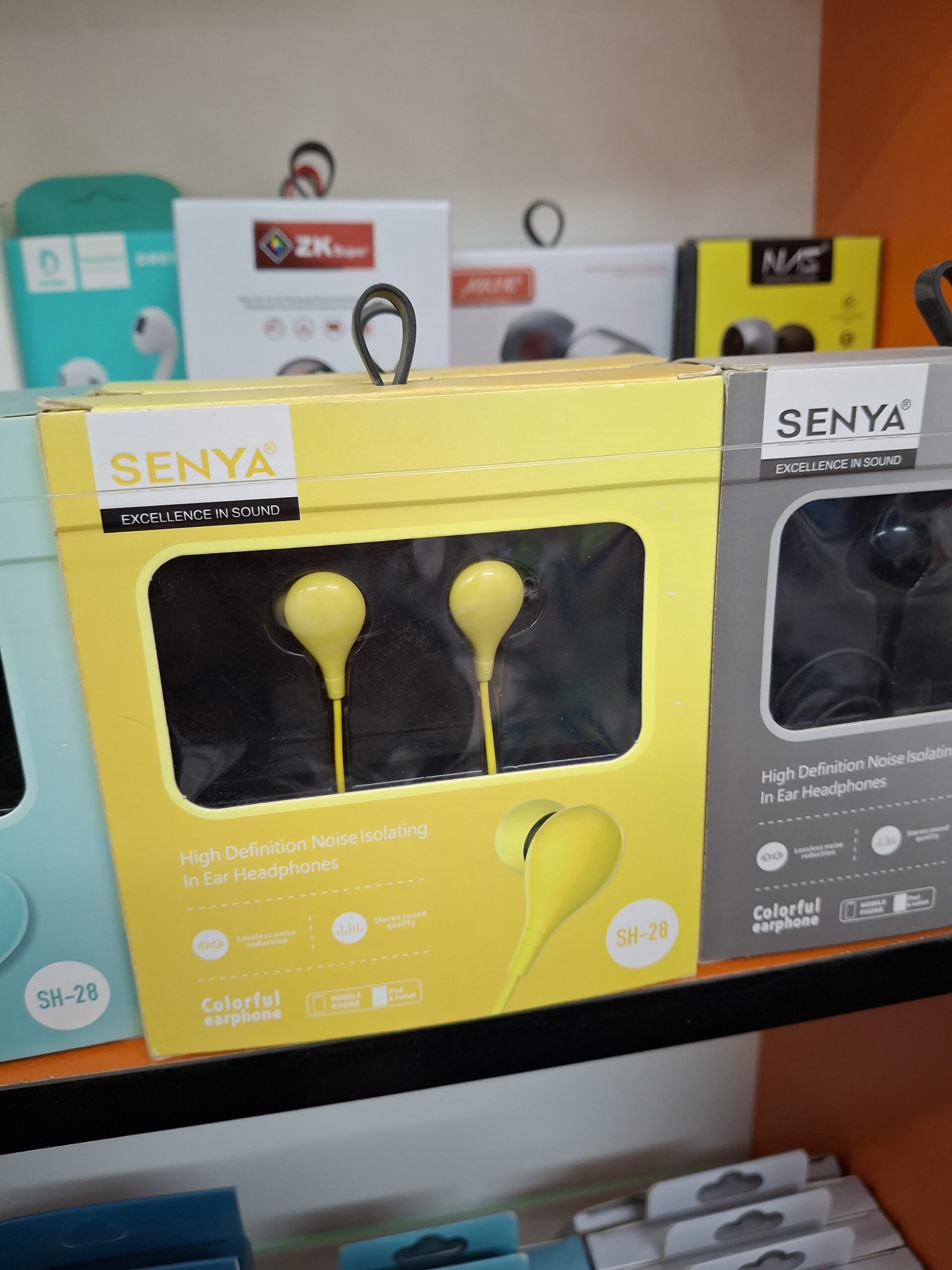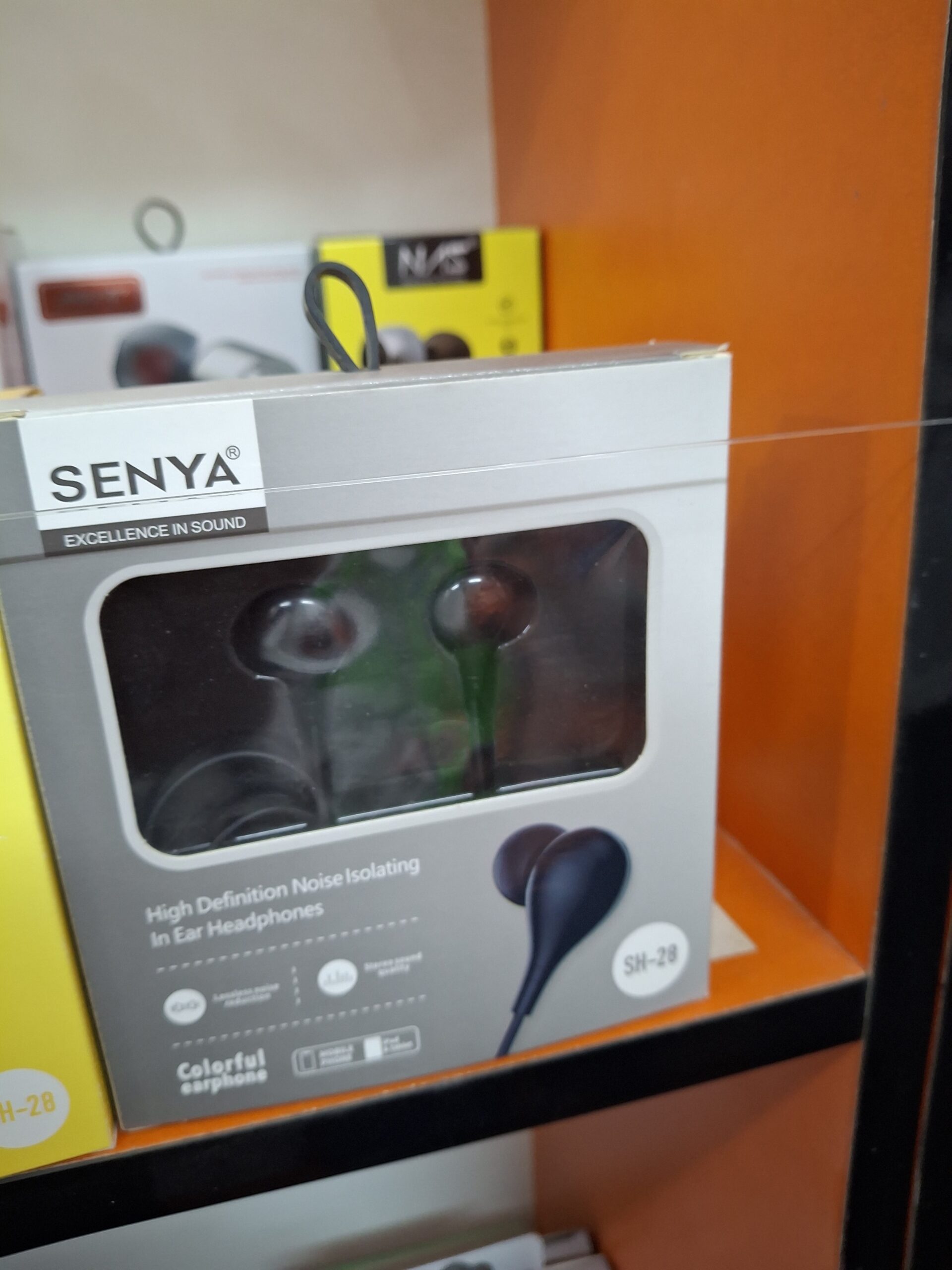 Enjoy clear sound and deep bass with SENYA SH-28 wired earphones, featuring noise isolation, comfortable in-ear fit, and vibrant color options. Available now at Ahmad Mobiles, AWT Phase 2 Lahore.